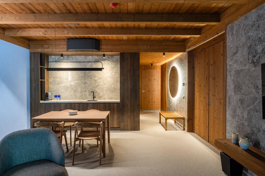 Construcții: Lemn masiv, grinzi stratificate, fațade din lemn și materiale izolatoare.