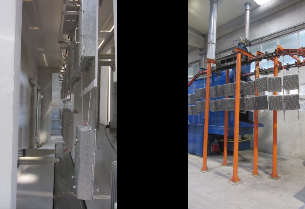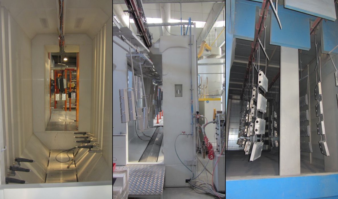 Instalațiile de vopsire cu pulbere sunt formate din bandă transportatoare suspendată, un tunel de tratament, cabine de vopsire cu pulbere și un cuptor de polimerizare cu recircularea aerului cald și cu eliminarea forțată a aerului.